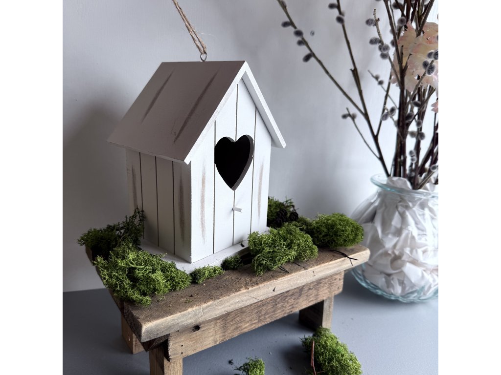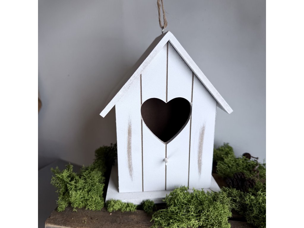 Dřevěná budka s bidýlkem v bílé barvě se srdíčkem