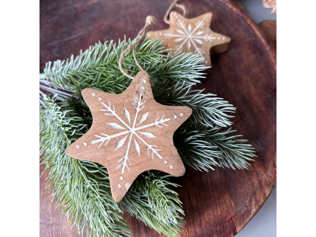 Dřevěná hvězda k zavěšení. Motiv vločky.