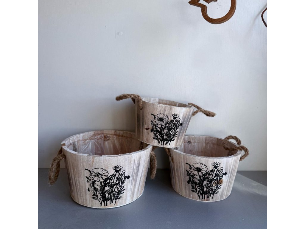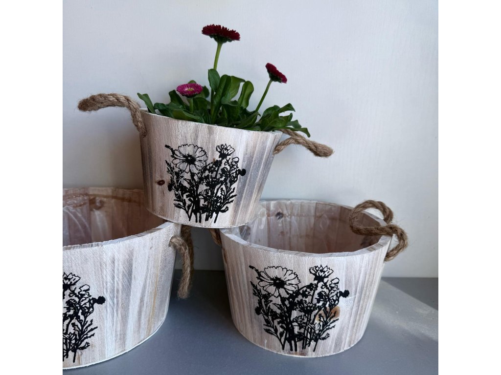 Dřevěná vědra s motivem lučních květin s provazem. Vnitřek vyplněn igelitem.