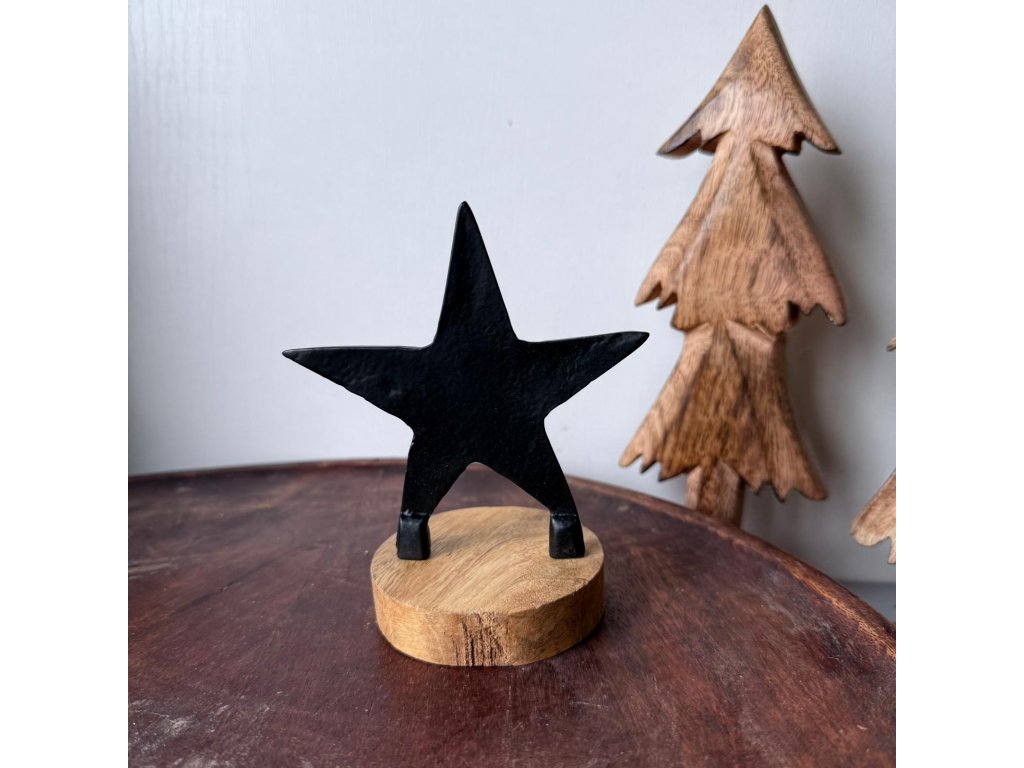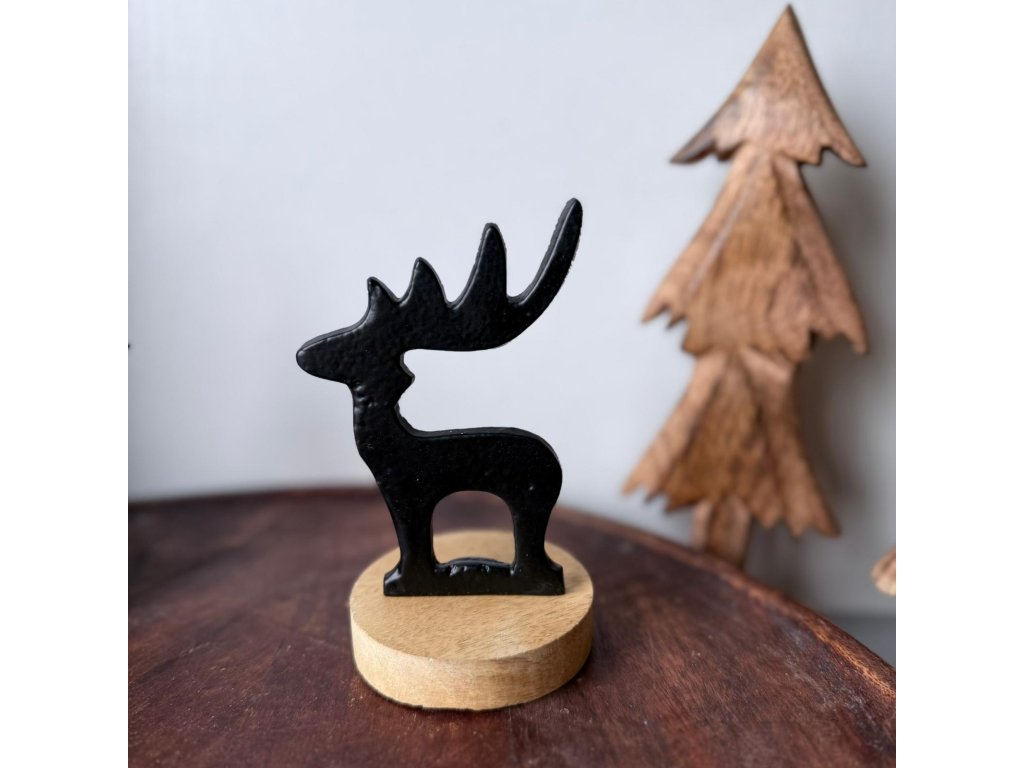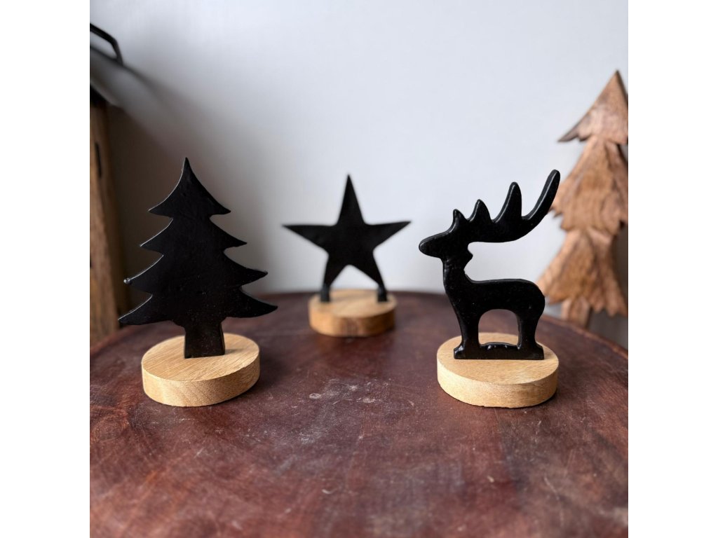 Vánoční motivy na dřevěném podstavci. Motivy jsou z kovu v černé barvě.