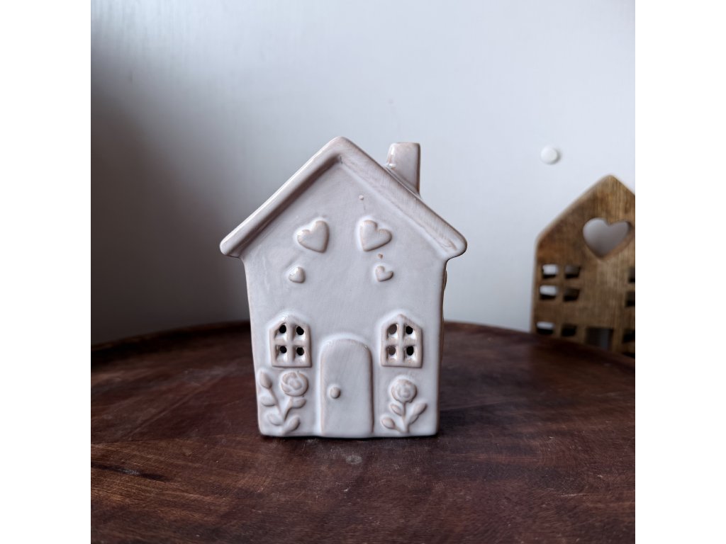 Keramický domek na svíčkuRozměry: 9,5 x 7,5 x 12 cmMateriál: keramikaBarva: krémová