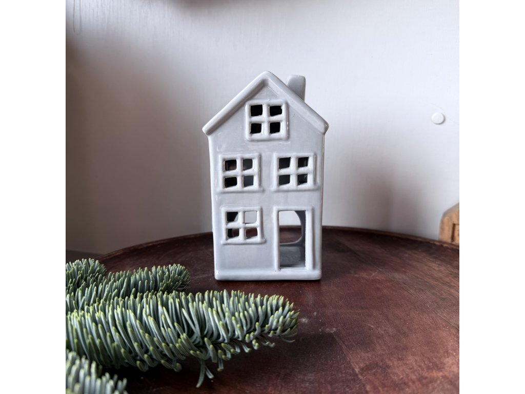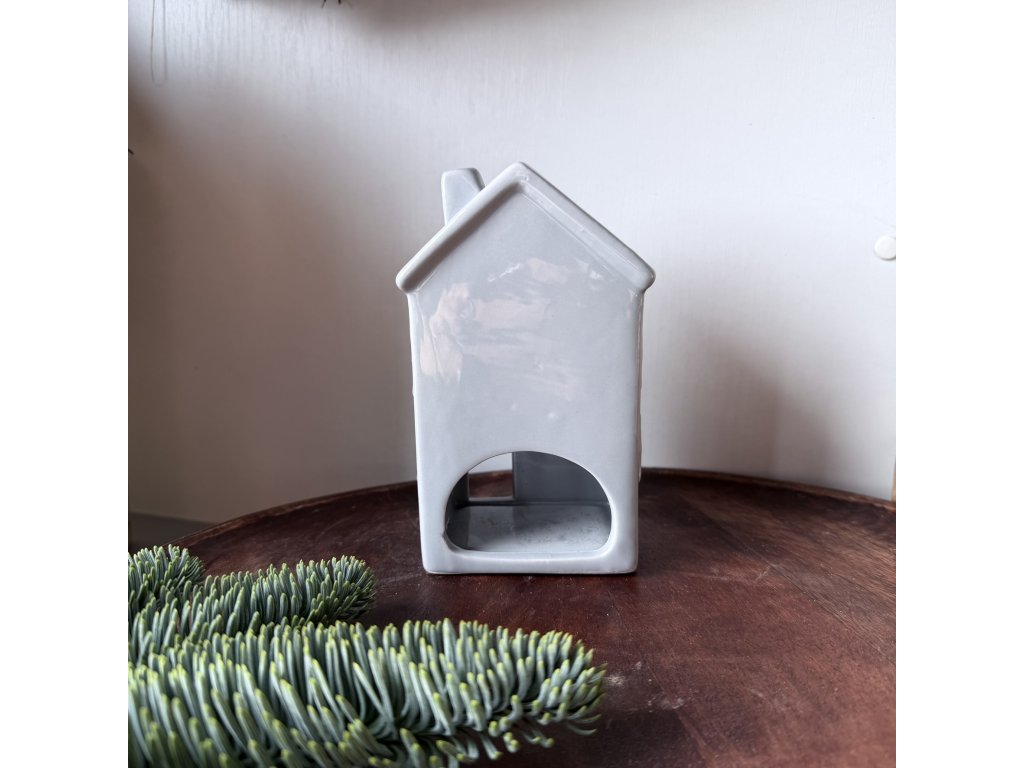 Keramický domek šedá barva, vzadu otvor na čajovou svíčku