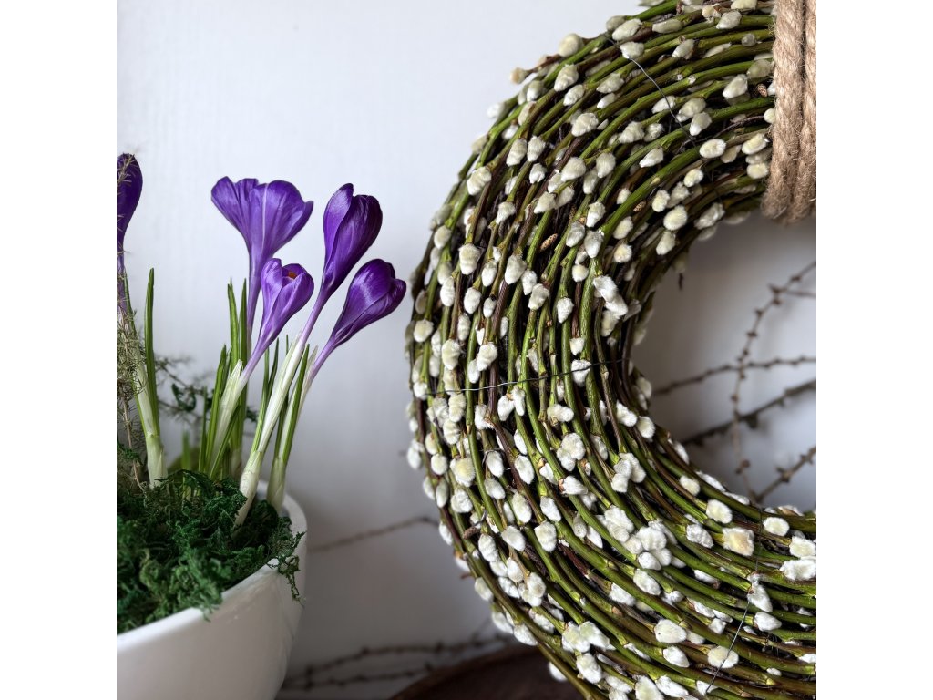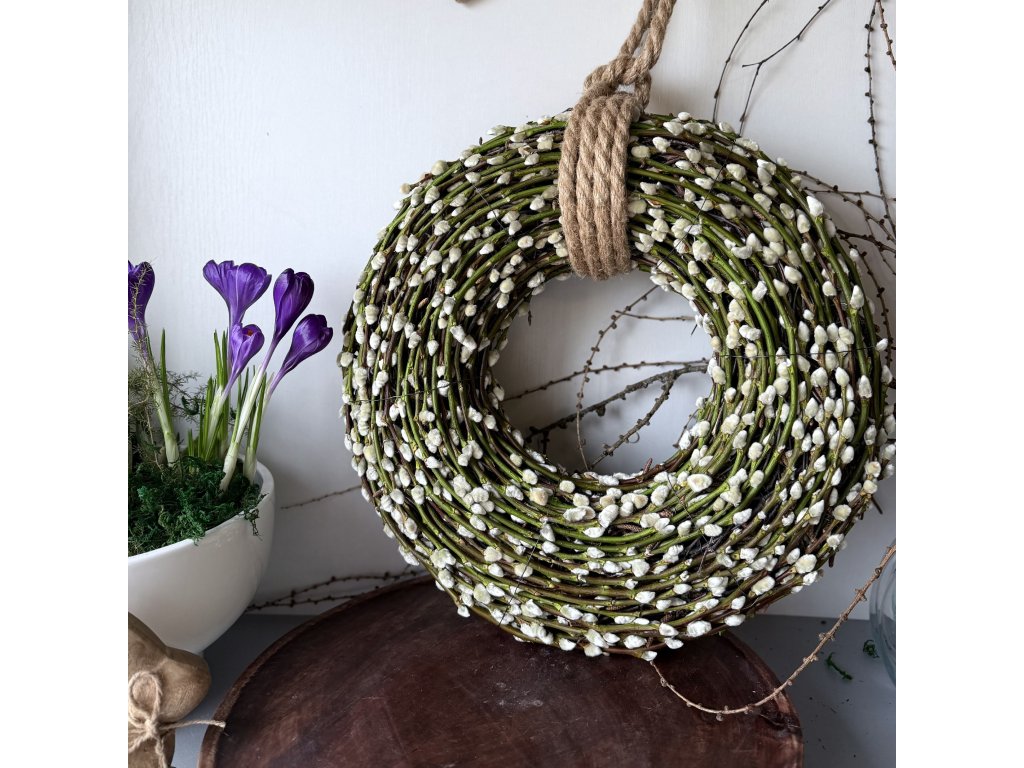 Přírodní a nadčasový věnec, který vydrží i roky, když nebude přímo na dešti. Kočičky jsou živé a postupně seschnou.