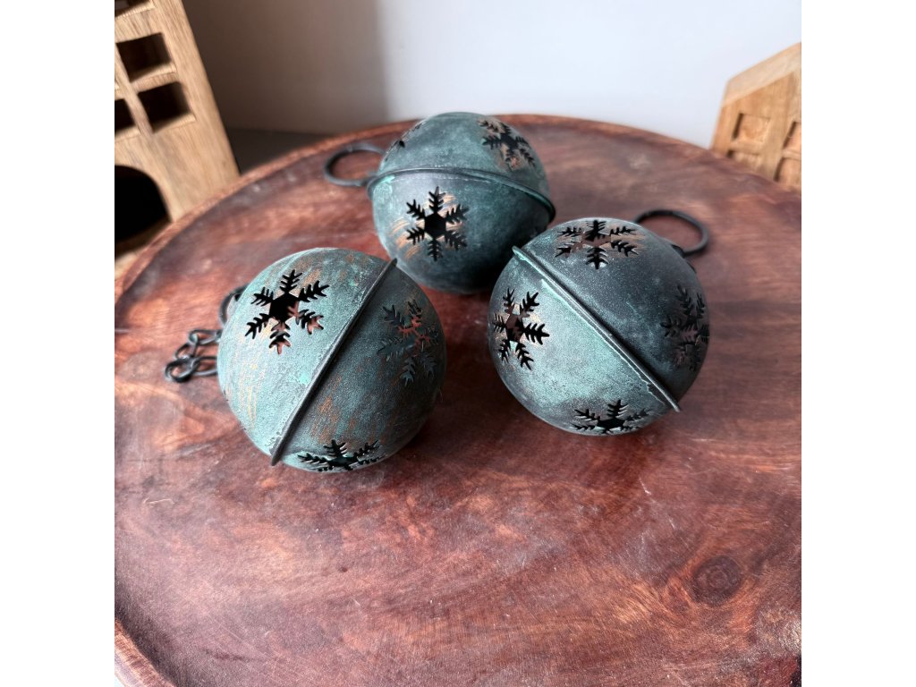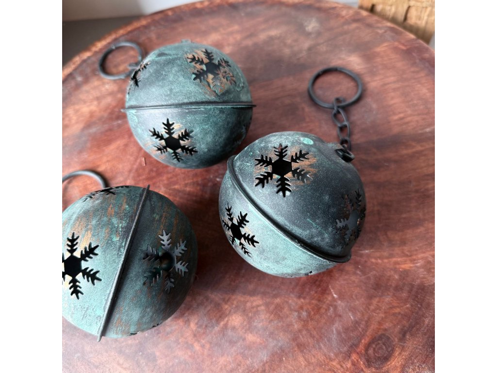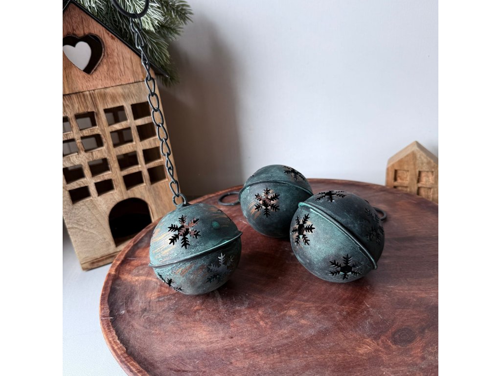 Kovová rolnička zlatomodrá patina 9cm vločka