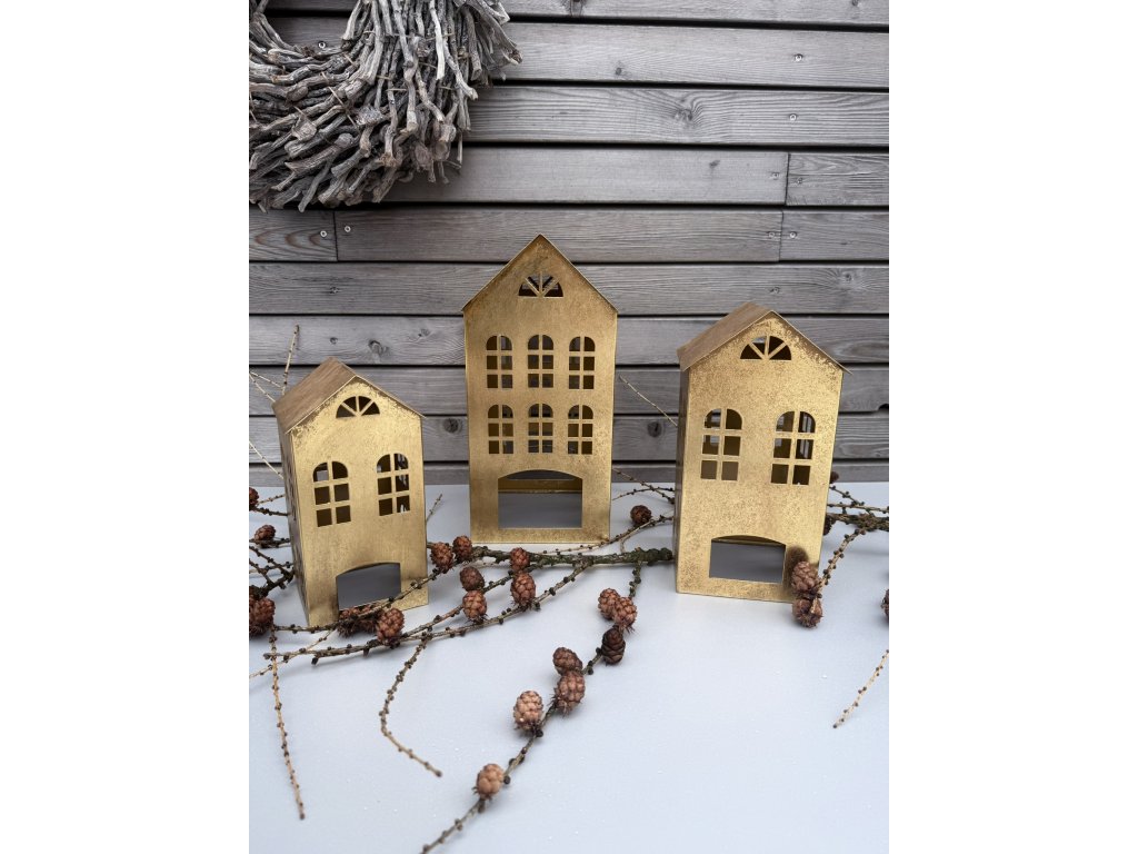 Sada 3ks kovových patrových domů ve zlaté barvě. Lze použít jako svícen/lucerna