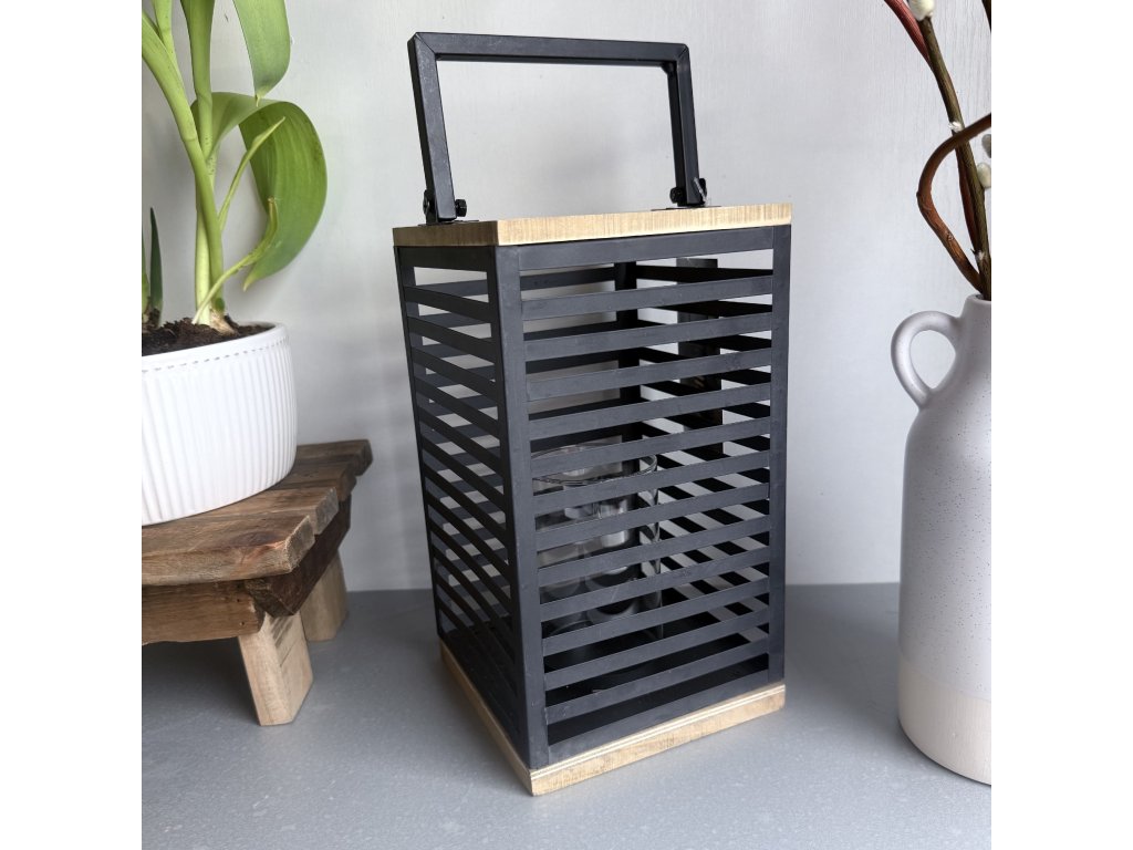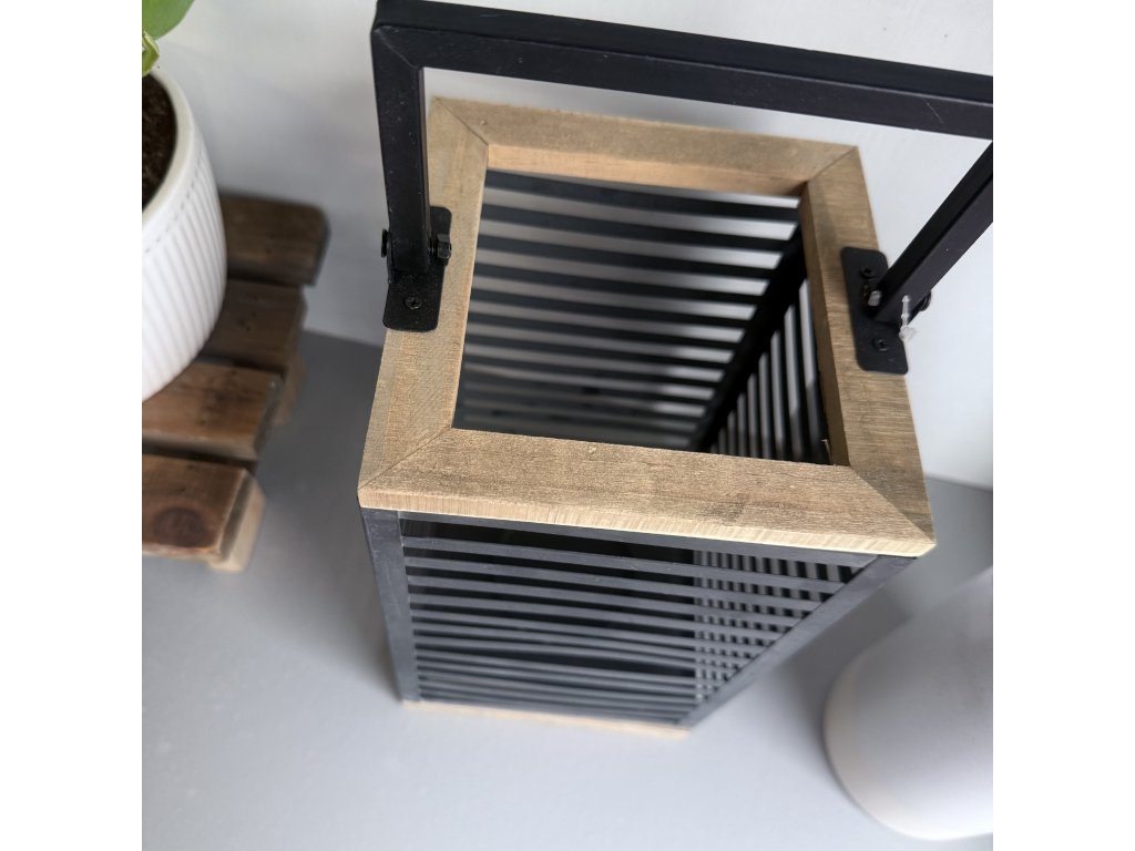 Moderní lucerna, dřevo a kov jako neohraná kombinace materiálů. Součástí je skleněná nádoba na svíčku.