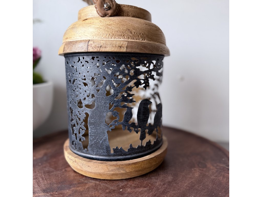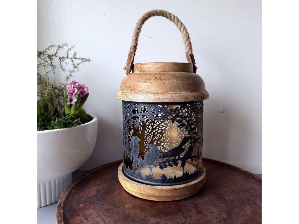 Netradiční lucerna z oblíbeného tvrdého dřeva MANGO. Kovový motiv s ptáčky, který přivolá to správné jaro. Možnost zavěšení díky pevnému lanu.
