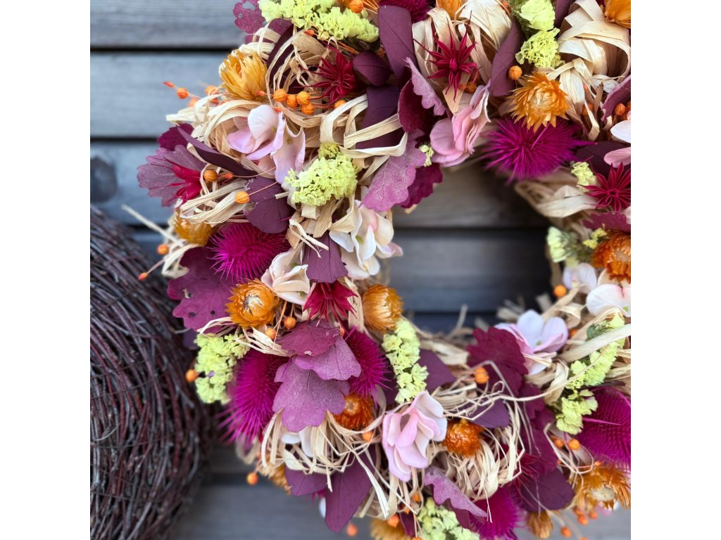 Unikátní věnec plný barevné energie – růžová, fuchsiová, oranžová a žlutá se nádherně doplňují s přírodními tóny lýka a sušených květin. Působí živě, svěže a hravě, ale stále zůstává v podzimním duchu.