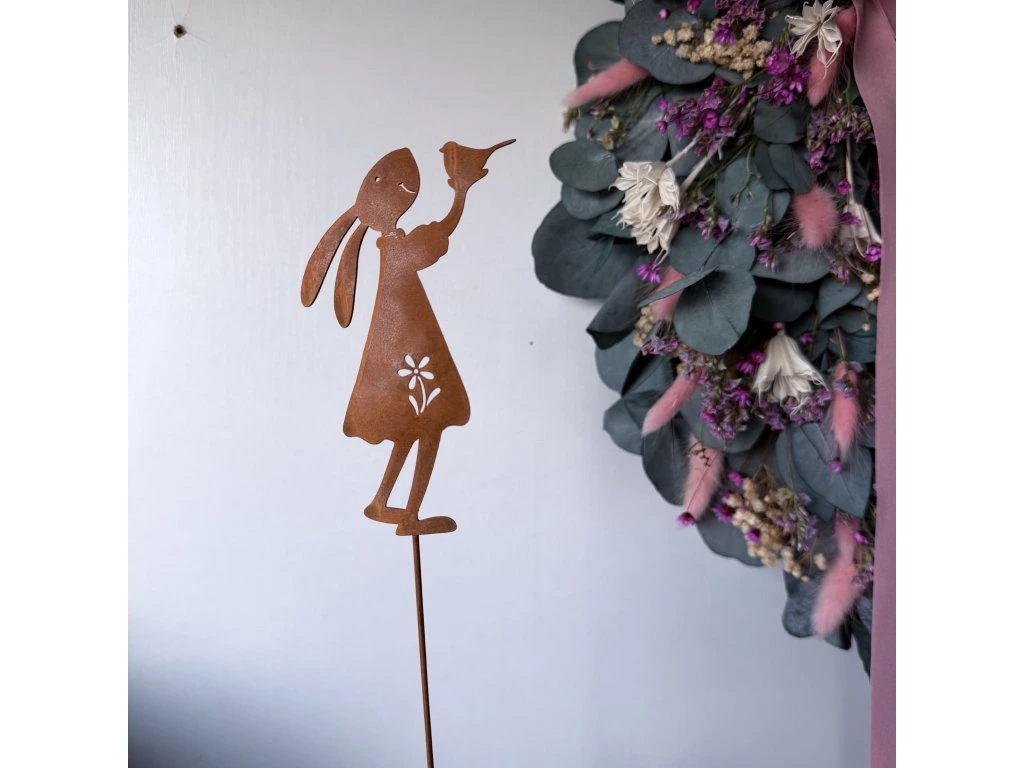 Oblíbená rez v podobě zajíce s ptáčkem - jarní motiv. Kovový zápich.