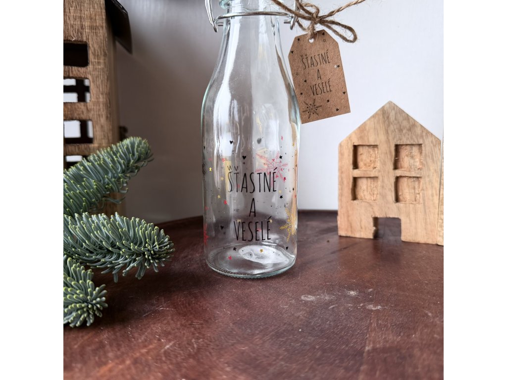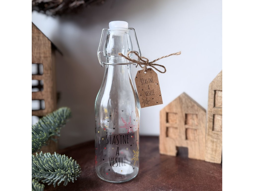 Skleněná láhev s nápisem VESELÉ VÁNOCE