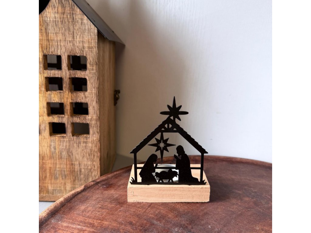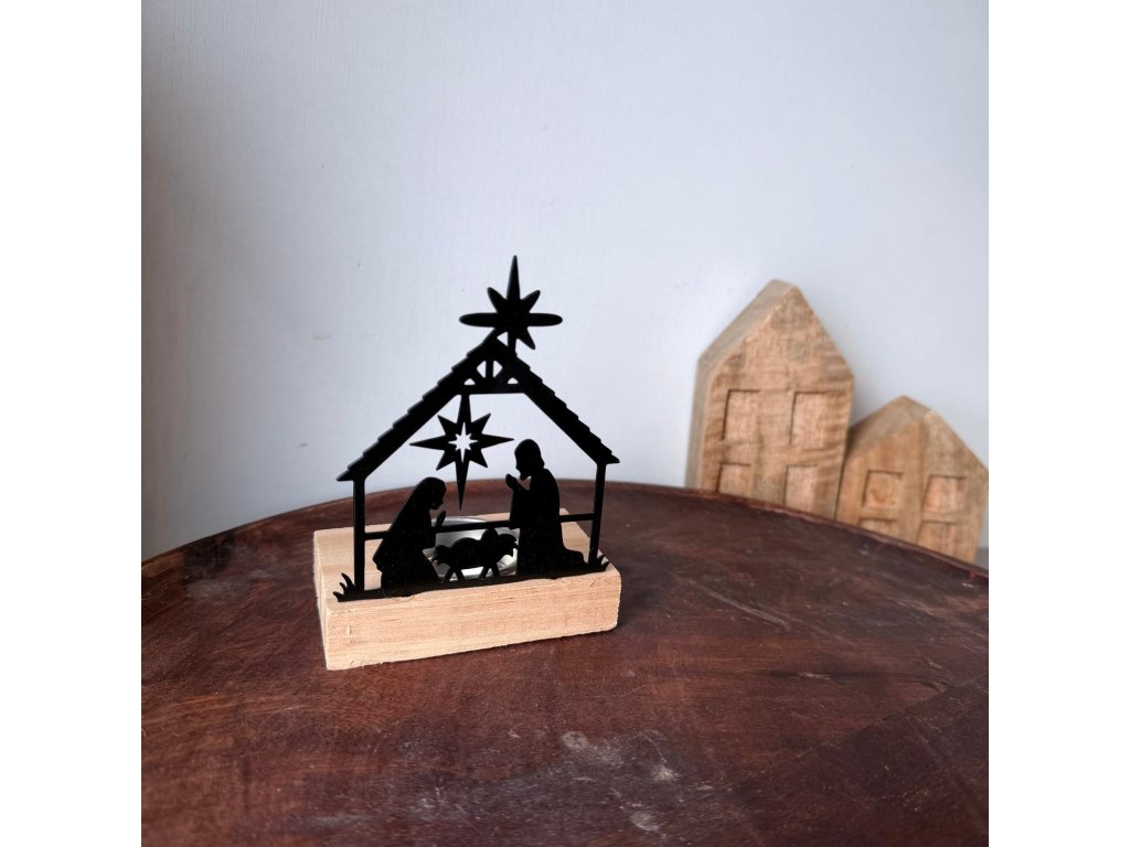 Kovový betlém na dřevěném podstavci na čajovou svíčku.