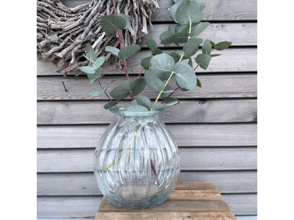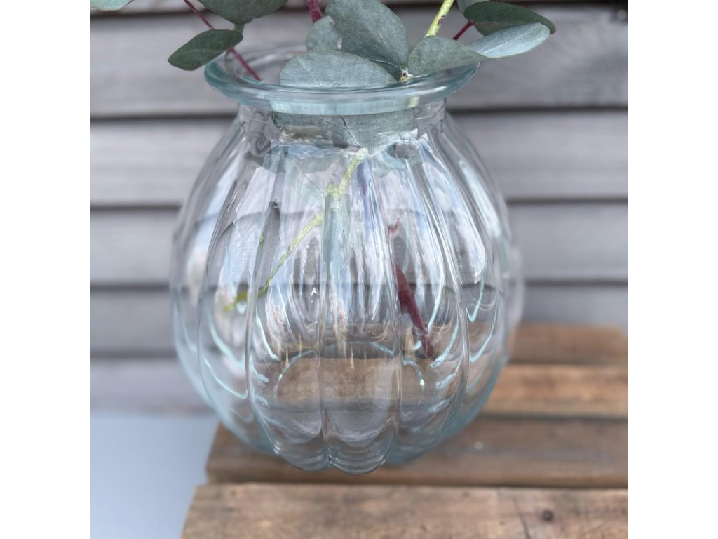 Velká skleněná čirá váza s vroubky. Vhodná na čerstvé květiny, umělé. Dekorace v podobě stabilizovaného mechu, pár větviček a sukulent či jiná květina rozhodně dodá na originalitě této vázy.